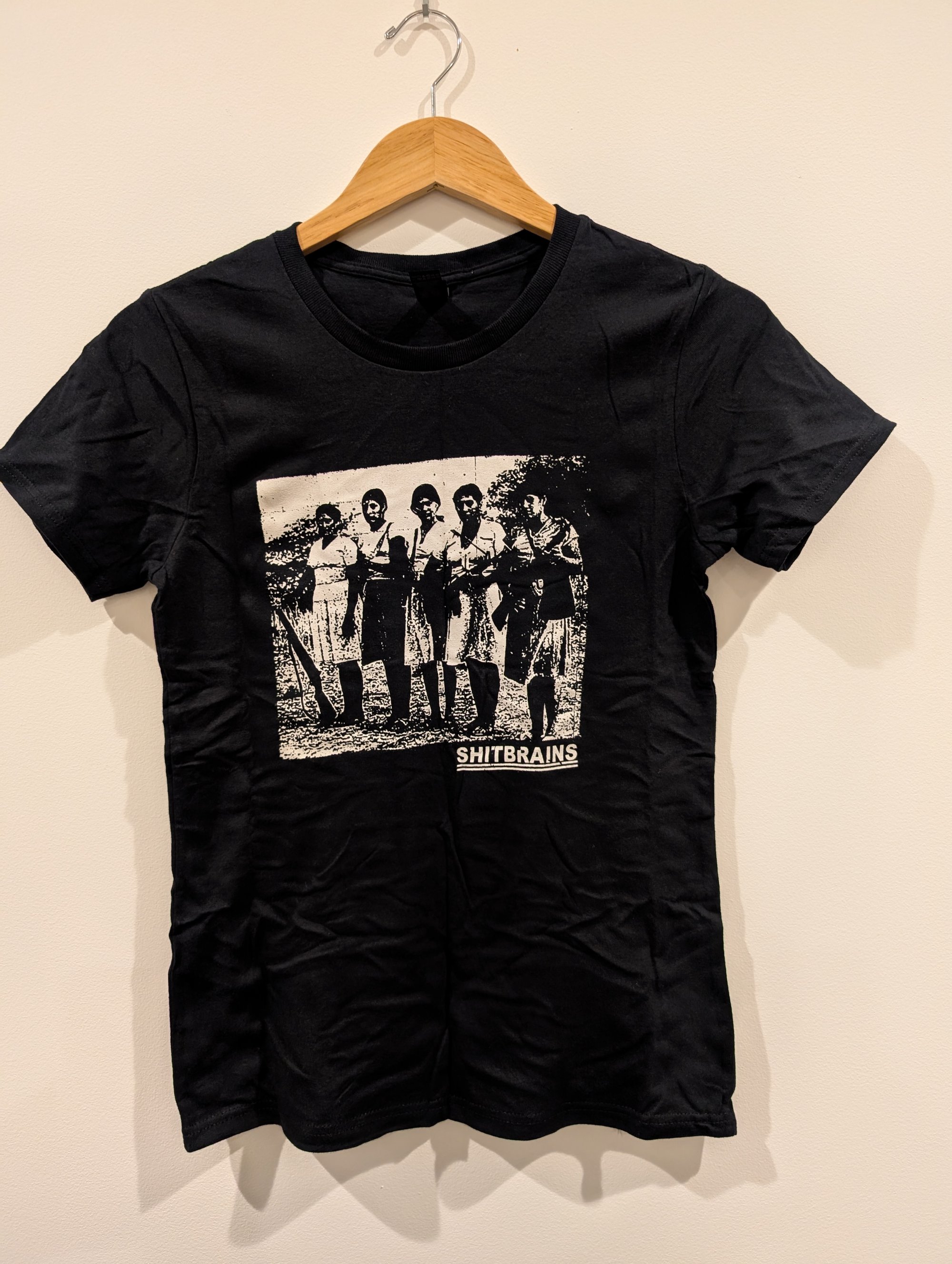 White print on black shirt. Front print only. These are women's shirts that we accidentally ordered. The difference between them and the usual unisex shirts is that the sleeves are slightly shorter (like Euro shirts). The size is also about a full size smaller than unisex shirts. So if you normally wear an L, you should order an XL. Otherwise they are pretty much the same. They don't taper at the waist.